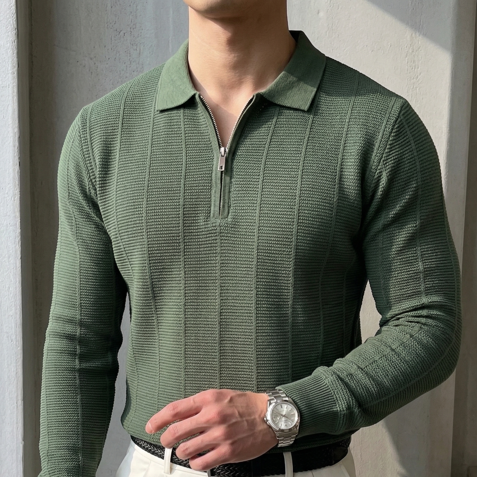 Finition “Premium” : Col polo avec fermeture éclair métallique fluide et liserés contrastés sur le col et les poignets pour un rendu haut de gamme.